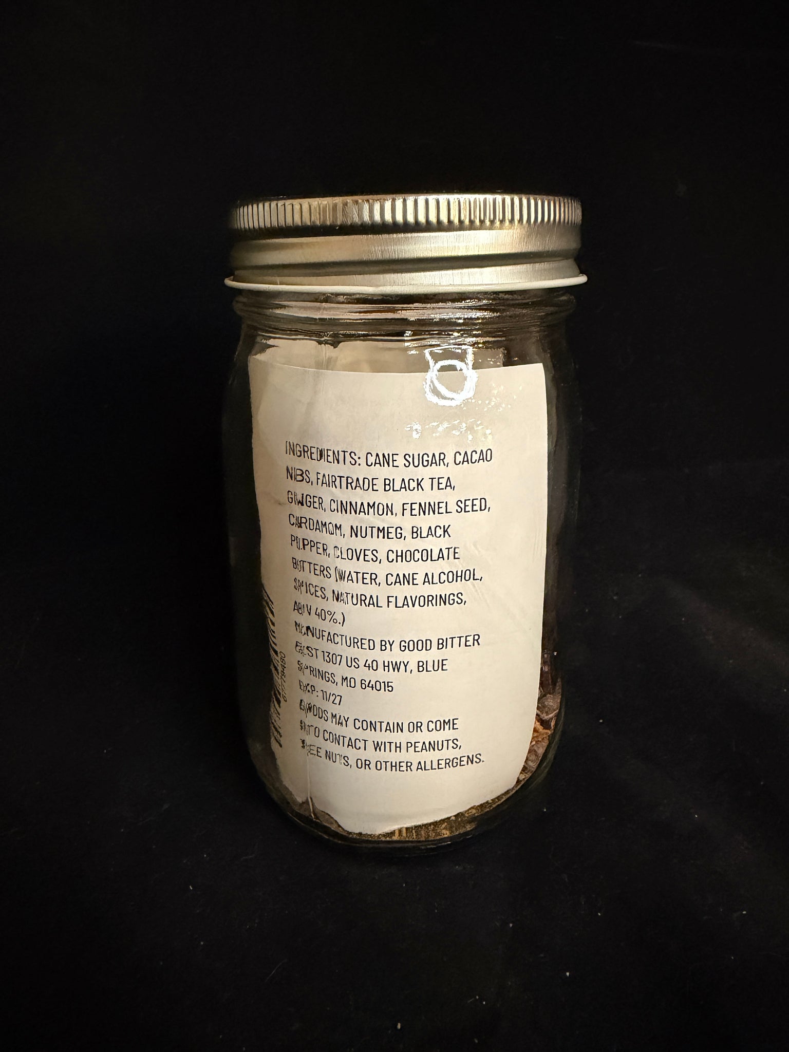 Chocolate Chai-tini Booze Infusion in a 16 ounce glass jar.